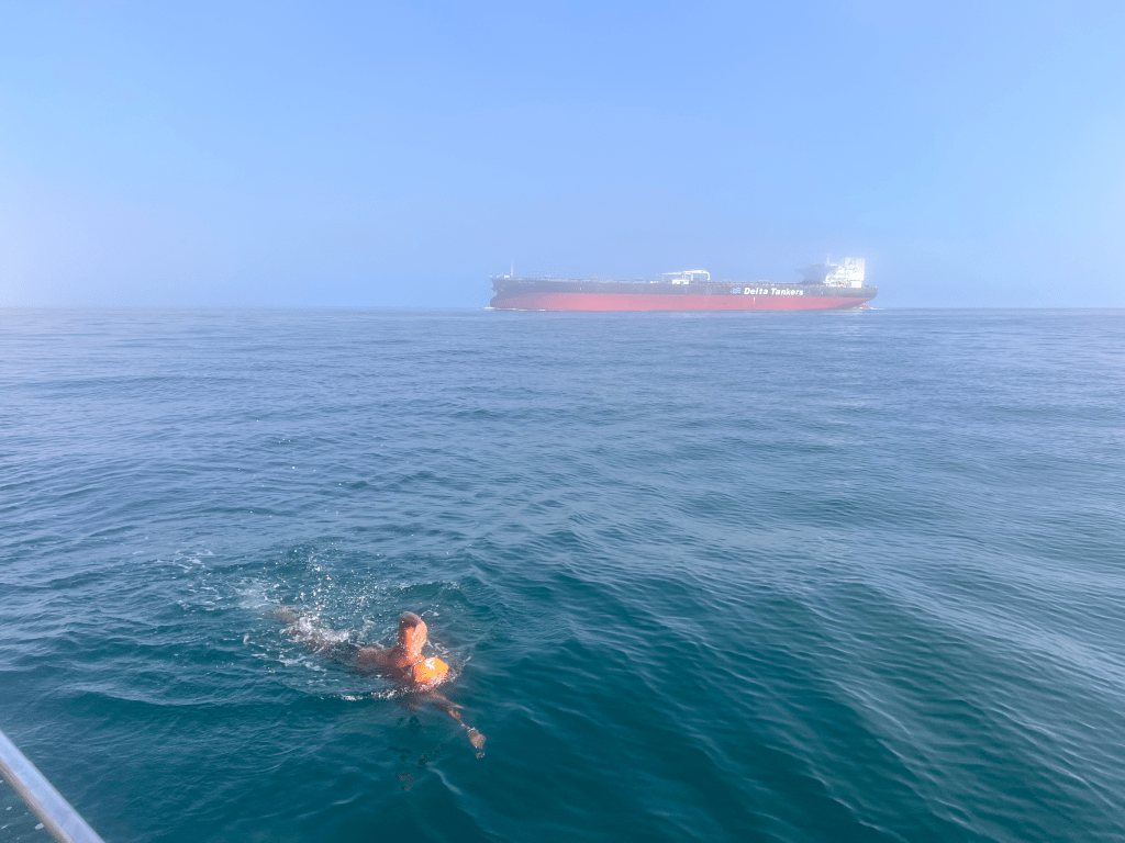 All the lessons came rushing back, and I popped up, doing a few breaststrokes while Rohan made his way to the back of the boat – I couldn’t see him, so I waited for Adam to tell me when I should start swimming. He gave me the thumbs up, and I was off.